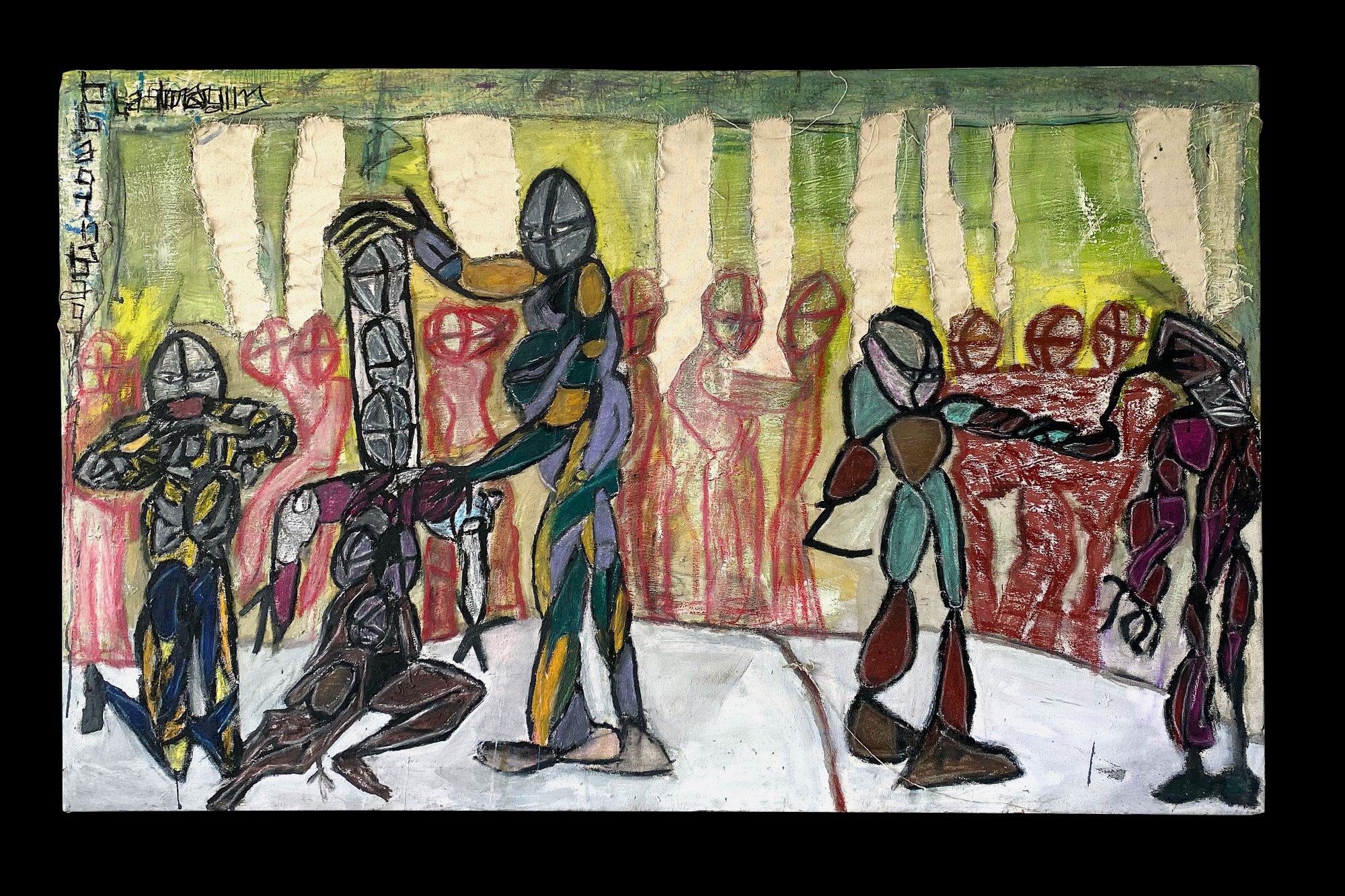 Olej, pastele, wyszywanie na płótnie